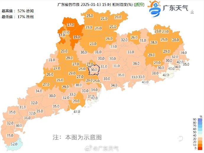 1月13日15时,广东阳山、连州等地相对湿度已低于20%。