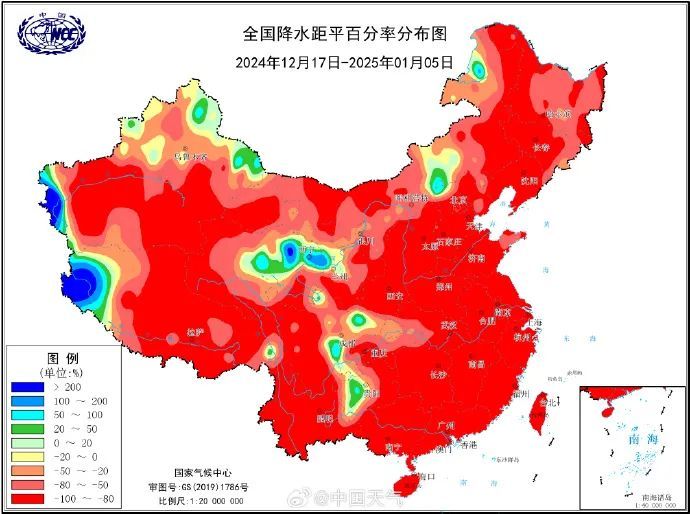 近一个月以来,从华北到华南的中东部大部地区降水都较长年同期偏少8成以上。尤其江西南部、广东中西部、广西东部一些站点2024年12月以来的降水量以致为0,其中广东近半站点2024年12月以来都是滴雨未落。