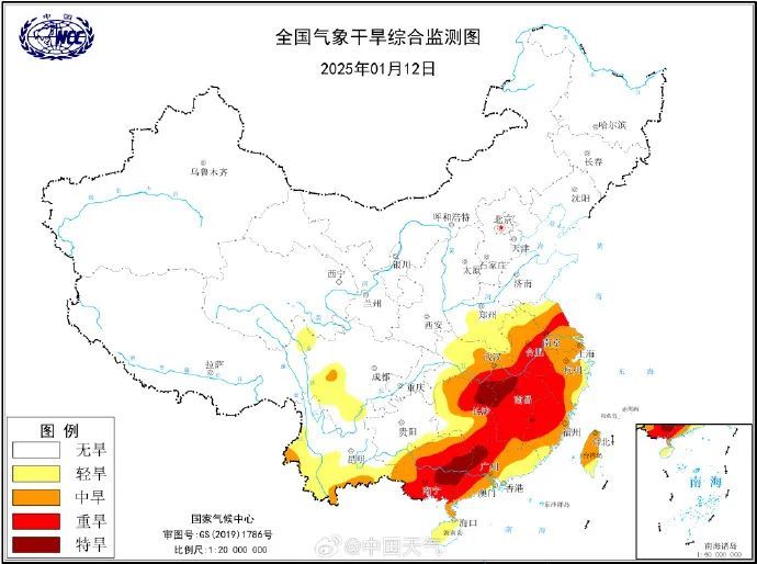 1月12日的征象干旱监测图披露,广西、广东、湖南、江西等地的部分地区达到了特旱级别!