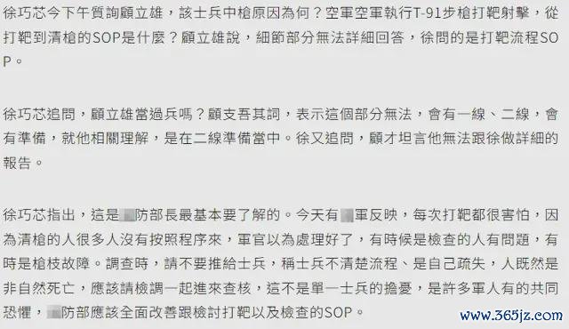 更搞笑的是,在吸收台“立法院”的质询时,别称女委员向顾立雄发问事故发生时的射击经过,但清闲一个上士班长齐能倒背如流的射击SOP,堂堂的伪“国防部长”尽然支简易吾答不上来!这名委员还进一步暗示,我方也曾接到台军士兵的反应,说射击检修一直存在安全隐患,验枪不仔细,枪械也频频出现故障,要求台军严作风查事件的详备经过,不要只是把职守推在士兵身上。